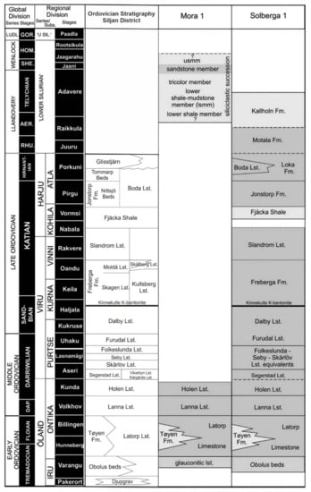 Combined stratigraphic diagram of the Ordovician sedimentary succession in the Siljan District (modified from Ebbestad and Högström 2007 []) and lithostratigraphic columns of the Mora 1 and Solberga 1 core sections (according to data from Lehnert et al., 2012 []).