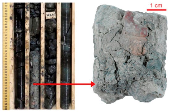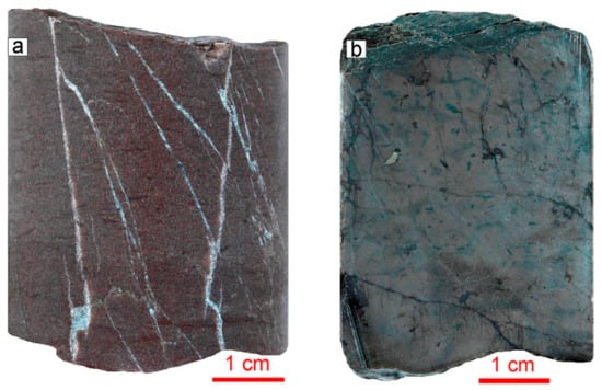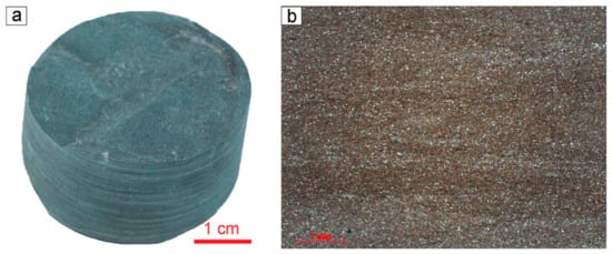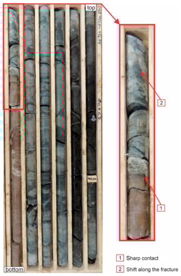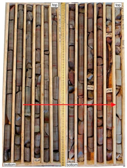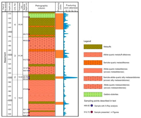 The basement interval comprises Proterozoic metavolcanic and metasedimentary rocks with a single mafic intrusion (gabbro-dolerite) in the upper part. Mineralogical changes in the rock composition, such as fine-grained sericite and albite neoformation, reveal that the area has gone through the low-grade stage of metamorphism at temperatures presumable up to 200 °C [,,,]. However, the rocks often have relict sedimentary structures, such as horizontal and lenticular layering. Thus, it could be possible to suggest that these rocks have been only partially metamorphosed.