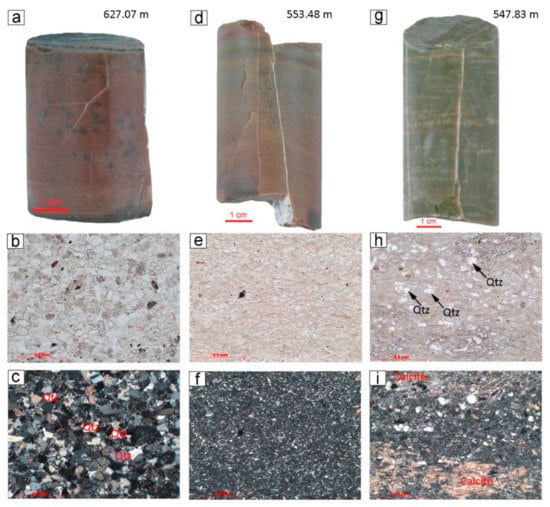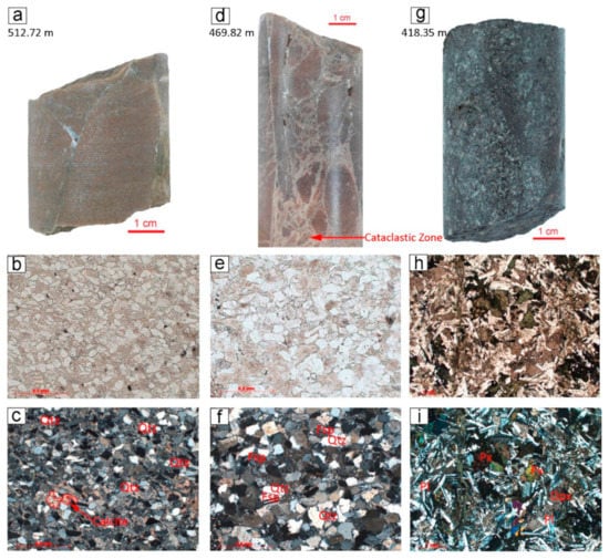 Rock samples from the lower part of the basement interval: (a,d,g) sample photos; thin section photos (b,e,h) in plane-polarized light; (c,f,i) with crossed polars (magnification 10×).