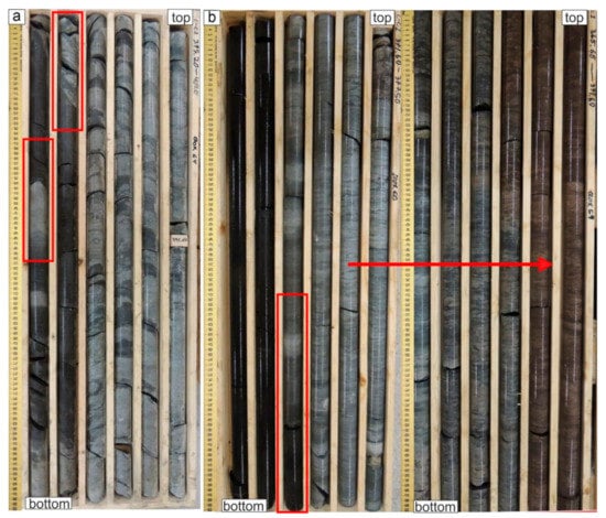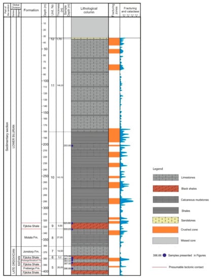 However, the intercalation of the limestones and layers of Fjäcka Shale does not correspond to the regional stratigraphy scheme and lithological column of the adjacent areas [,,]. Moreover, in the fifth unit, there are clearly recognizable features of disturbance, such as the sharp contact between black shale and wackestone layers, and slump structures in the wackestones.