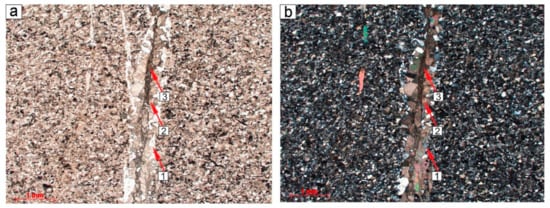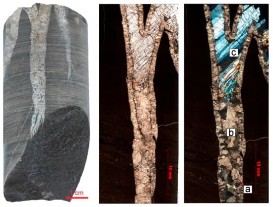 The first two generations are only established in the basement rocks and were accompanied by hydrothermal circulations. The first stage resulted in quartz mineralization while the second stage resulted in calcite mineralization. It may be suggested that mafic dyke intrusions correlate with the peak of the first fracturing event when the maximum extension might have had taken place. The absolute age of dolerite dykes in the region was estimated to be 0.9–1.1 Ga []. Thus, there were obviously changes in the chemical composition of the fluids for the two tectonic events that affected the basement rocks before Paleozoic sedimentation. However, the inheritable sequence of mineralization, possibly shows that it happened at the same time as fracturing phases.