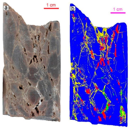 The cataclase and zones of calcite filling have mostly developed along the fractures. The segments of each component were marked with different colors. Same-color segments form macrocomponents. Component images were converted into a binary format, in which component pixels were labeled by units, and the remaining pixels were zeros. The binary results were divided into geometric segments by program processing.