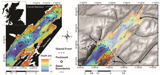 Maps of Loch Linnhe; (a) bathymetry of Loch Linnhe, location of pockmarks and basins; KB—Kentallen Basin, BB—Balnagowan Basin, B.Bnk—Balnagowan Bank, SB—Shuna Basin, S.Bnk—Shuna Bank, LB—Lismore Basin, L.Bnk—Lismore Bank; (b) map of the glacial ice cover during the Younger Dryas based on the model by [33]. Arrows show the main glacial flow from Rannoch Moor (west) and tributary glaciers from the east.
