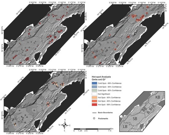 Hot-spot analysis using the Getis-ord Gi* statistic of pockmarks within Loch Linnhe along with an inset map showing main basins mentioned in Figure 1; (a) hot-spot analysis of all pockmarks within Loch Linnhe; (b) hot-spot analysis of pockmarks that occur within the region of the boomer seismic survey; (c) hot-spot analysis of pockmarks where gas was observed in seismic profiles.