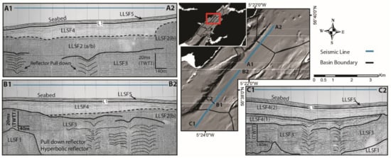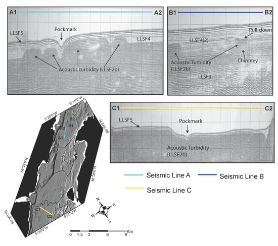 Analysis of selected seismic lines that contain pull-down reflectors. Map shows the position of seismic lines, basin boundaries. Labelled seismic lines sections correspond to the seismic profiles A:C. Dotted lines within seismic profiles show the position of the surface reflector for LLSF2, where LLSF2b indicates acoustic turbidity.