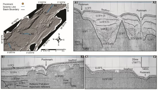 Our seismic interpretation has been adapted from the Loch Linnhe seismic facies (LLSF) framework outlined by McIntyre (Table 1) [28]. A common feature in every line is the L1 reflector. This reflector occurs at the base of LLSF5.
