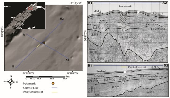Seabed pockmarks are relatively widespread across the continental shelf around Scotland, occurring mainly in the North Sea sector, discovered during oil and gas surveys [11,15,16]. More recently, pockmarks have also been discovered further inshore within the fjords and fjord approaches of western Scotland [17,18], similar in size and bathymetric setting to those identified in the western fjords of Arctic Svalbard [19,20,21]. These fjordic environments are shown to be effective stores of organic carbon [22,23]. However, the presence of pockmarks indicate that these stores are not permanent and that gases, such as methane, can seep into the water column back into the marine carbon cycle [5,24]. Certain studies have shown that this gas can also enter the atmosphere [24,25], although this is dependent on water depth and local hydrographic/meteorological factors [26]. It is thought that pockmarks in Scotland’s fjords are formed by the release of shallow biogenic gas, whereas those further offshore in the North Sea sector are related to deeper-seated thermogenic gas accumulations [15]. This is supported by research into the carbon signature of fjordic and offshore/shelf sediments, where the majority of organic carbon is stored within fjordic systems; however, localised hot-spots of organic and inorganic carbon can also be found in sediments of the wider continental shelf [27]. Regional mapping of pockmarks in Scottish west-coast waters has suggested a link between pockmark morphology, hydrographic setting and the activity history of pockmarks [18]. The authors have already mapped pockmarks within Loch Linnhe, part of a wider mapping initiative, and inferred the presence of widespread seabed gas/fluid escape (of unknown age). Previous unpublished research investigating the glacial history of the wider region also found some geophysical evidence of sub-seabed gas in the same inlet (or sea loch) [28,29]. However, neither of these studies fully explored the relationship between sub-seabed gas and the presence of pockmarks at the seabed. In this paper, we explore the three-dimensional spatial relationships between sub-seabed gas presence and pockmark formation in Loch Linnhe, to answer the following questions: