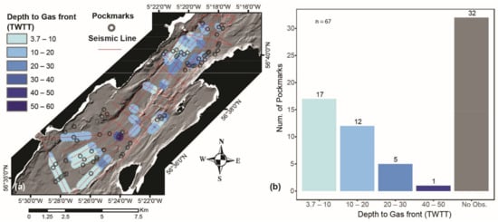 Study area showing boomer seismic survey lines and pockmarks; (a) depth to gas front (TWTT), where gas was observed in seismic profiles; (b) bar-plot showing number of pockmarks within each depth to gas front band.