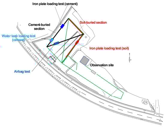 Test site schematic of the experiments. The fiber cable was installed in a shallow trench (green line) and the red and black segments indicate the sections covered by soil and cement, respectively. Four colored rectangles along the red and black segments show the test positions and the iron plate loading test was performed at both the soil and cement sections for comparison. The water tank loading and airbag tests were carried out only at the cement section.