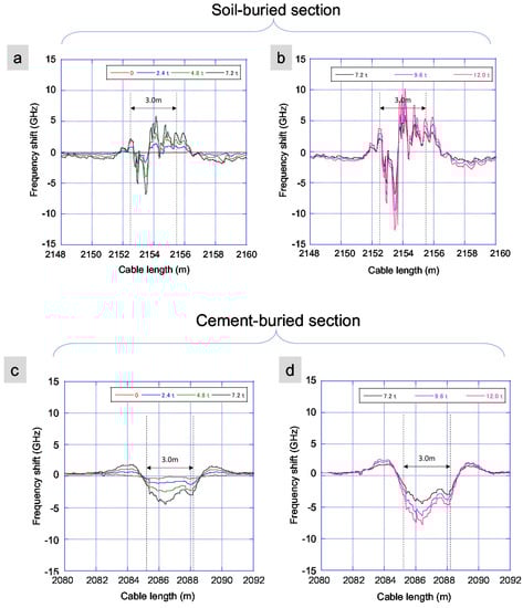 Figure 2c,d show the Rayleigh frequency shift as a function of cable length for the fiber covered with cement. The results for the first three stages (blue, green, and black lines shown for 2.4 ton, 4.8 ton, and 7.2 ton, respectively) are shown in Figure 2c, while Figure 2d shows the Rayleigh frequency shift with the cable length for the last three stages (black, purple, and pink lines shown for 7.2 ton, 9.6 ton, and 12 ton, respectively).