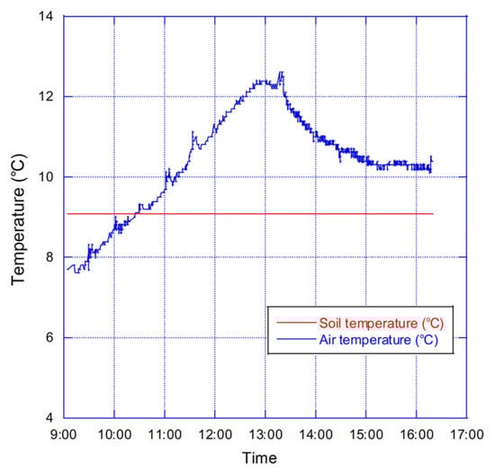 Two T-type thermocouples connected to a data logger (Tokyo Measuring Instruments Laboratory, Tokyo, Japan) were used to monitor air and soil temperature change in this study. Figure 3 shows the air and soil temperature measurement result from 9:00 am to 4:30 pm during the iron plate loading test. The air temperature increased by roughly 4 °C by 1:00 pm due to exposure to sunlight and decreased gradually to about 10 °C until 4:30 pm. In spite of the air temperature variation the soil temperature (red line) was almost constant roughly 7 °C throughout the loading test period. This result suggests there is no temperature effect on the Rayleigh frequency shift in ground surface measurement.