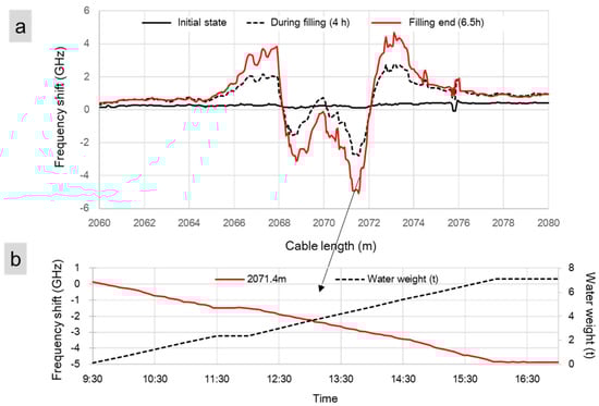 Figure 4a presents the Rayleigh frequency shift along the cable during filling (dashed line) and after filling (red line). The two lines show two positive peaks around the tank sides with different magnitudes, indicating uplift, and negative values in the middle (at the tank position), indicating subsidence, with respect to the different magnitudes in each stage. During the filling process, the positive frequency reached a maximum of +3 GHz for both sides (2068 m, 2073 m) and a minimum of −3 GHz at 2071.4 m. After the filling process, the magnitude increased on both sides at the same positions, reaching +3.9 GHz, +5 GHz, and −5 GHz, respectively.