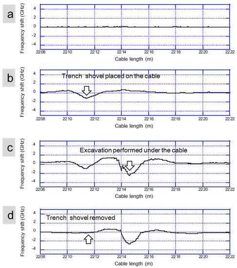 Results for the third test: DFOSS Rayleigh frequency responses when the trench shovel was placed on the cable, excavation was performed under the cable, and the shovel was removed. (a) Initial status, (b) Trench shovel placed on the cable, (c) Excavation performed under the cable and (d)Trench shovel removed.