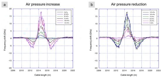 For the second part (airbag test), the change in Rayleigh frequency shift due to the increased pressure (airbag inflation) is shown in Figure 7a as a function of the cable length. The Rayleigh shift increased as the air pressure gradually increased, reached +16 GHz for a pressure of 125 kPa, indicating uplift above the two airbags. For the air pressure reduction, Figure 7b shows the Rayleigh frequency shift as a function of the cable length for each stage. The frequency shift changed from +16 GHz for a pressure of 125 kPa and gradually decreased to approximately 2 GHz for a pressure of 0 kPa.