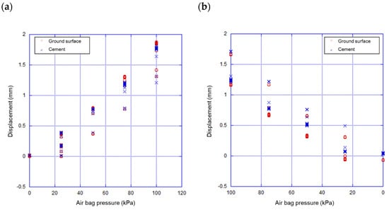 Ground surface and the cement layer deformation for the airbag test. (a) Displacements measured by the cantilever transducers when increasing the airbag pressure up to 125 kPa in five steps. (b) Displacements for the airbag pressure decreased from 125 kPa to 0 kPa.