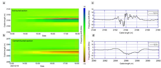 Comparison of the Rayleigh frequency shift response to a static load for the fiber cable covered by soil (a, c) versus the fiber cable covered by cement (b, d). Panels (a) and (b) present spatiotemporal frequency shifts. The yellow and red colors indicate the ground subsidence while the blue color indicates the ground uplift. Panels (c) and (d) present the frequency shifts at the last load step (12 ton) as a function of distance.