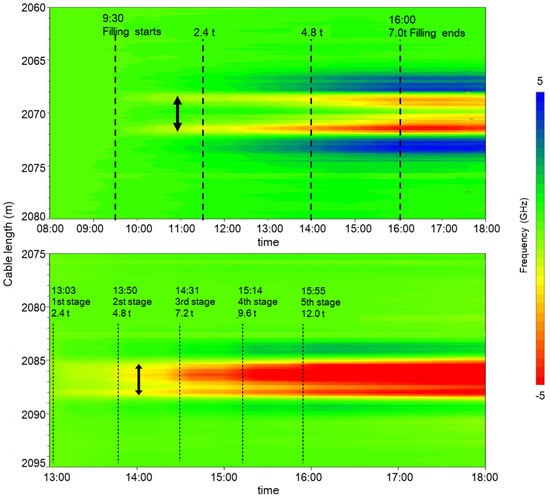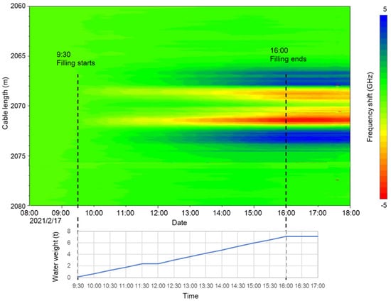 The results of the second test show a clear profile, with subsidence appearing under the tank due to the dynamic water filling up loading. Uplift was observed at the two sides approximately 1.5 h after the water filling process started. In Figure 10, the upper panel shows the time-lapse change in the frequency shit over the cable length for the fiber covered by cement, and water level changes are shown in the lower panel. The deformation magnitude increased over time as the water level increased, reaching a maximum when the filling stopped. The deformation maintained a constant magnitude, with the red color in the figure indicating subsidence and the blue color indicating uplift on the two sides. This result suggests that DFOSS can accurately detect deformations and anomalies along the cable for a long-term spatiotemporal surface deformation monitoring.