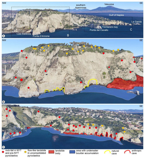 (A) Google Earth 3D views of the Coroglio-Trentaremi coastal sector. (B) Detail of the Coroglio sea cliff. (C) Detail of the Trentaremi sea cliff.