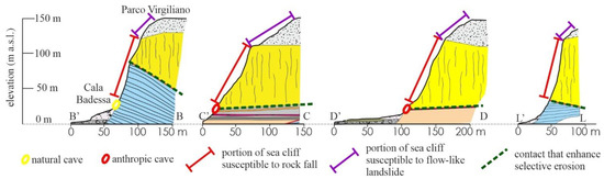 This analysis allowed us to reconstruct the main geomorphological features of the sea cliff, and to map the main landform indicators of slope instability. We gave particular attention to detachment niches and landslide bodies and to the presence of notches and cavities at the base of the sea cliff. The latter are indicators of undercutting by waves, which is undoubtedly the most important factor in causing coastal retreat [4,58]. The rate of undercutting is controlled by the complex and wide-ranging behavior of geological materials and by the great variability in their geotechnical properties. According to Budetta [24], the increasing depth of the notch into fractured rock mass, because of wave erosion, is responsible for the spreading of the shear stresses towards the top of the cliff and for the destabilization of the overlying slope. We also considered the presence of ancient quarries (mainly roman in age) for tuff extraction which, accordingly to Ruberti et al. [27], may also be considered as instability factors, especially if involved in the shear stress propagation caused by waves undercutting.