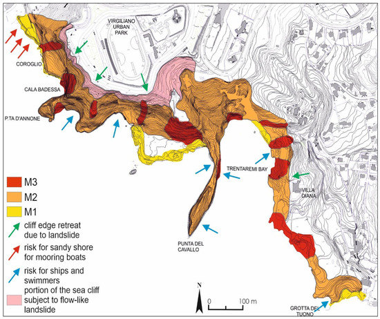 Geomorphological zonation of landslide magnitude along the Coroglio-Trentaremi sea cliff. M3: high magnitude landslide (hundreds to thousands of cubic meters involved); M2: moderate magnitude landslide (tens of cubic meters involved); M1: low magnitude landslide (few cubic meters involved). Arrows indicate areas subject to risk due to cliff edge retreat (green arrows), to the presence of sandy shore for mooring boats (red arrows) and to the presence of ships and swimmers (blue arrows).