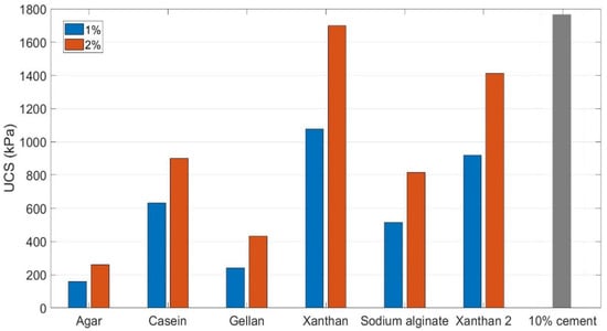 As seen in Figure 4, the available results show that xanthan biopolymer can increase the UCS values up to 1700 kPa when used to treat sand. The improved UCS value is variable depending on the type of biopolymer used. The lowest UCS value is observed when sand is treated with agar due to the repelling negative charges of both agar and sand. To improve the bond, adding a positively charged material as an intermediate agent would enhance the compressive strength remarkably [149]. Casein and sodium alginate showed almost similar performances, while gellan gum had lower strength compared with casein and alginate. Qureshi et al. (2017) compared the effect of xanthan gum and cement on the UCS variation of treated sand. In terms of peak UCS strength, using 2% xanthan is comparable to the strength obtained by using 10% cement. Xanthan-treated sand gained a less ductile behavior compared to cement-treated sand by showing higher residual strength [151]. Xanthan also demonstrated a notable increase in tensile strength which is in line with compressive strength improvement; the ratio of tensile strength per compressive strength was shown to be constant regardless of the biopolymer content [121].