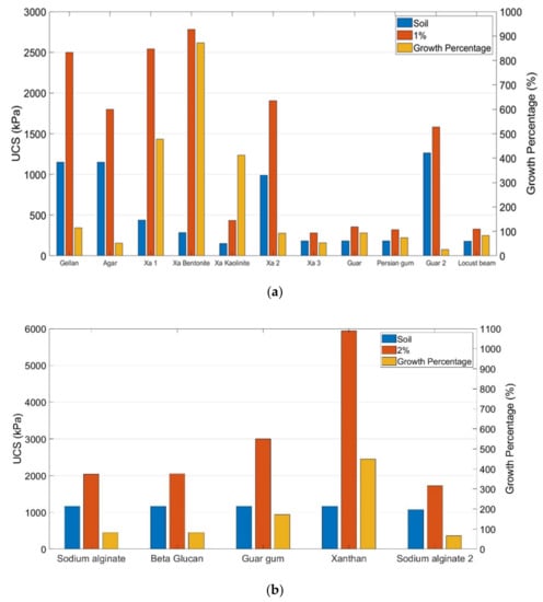 Figure 5 shows how biopolymers changed the compressive strength of fine-graded soils. In the case of agar and gellan gum, UCS increased to 2500 (114.8% growth) and 1800 kPa (52.2% growth) for 1% of gellan gum and agar, respectively. This higher amount of strength for gellan gum is due to the presence of multiple hydrogen and hydroxyl groups [62]. Xanthan gum has been comprehensively studied and the results are presented in Figure 5b. In one of the first studies using xanthan gum on clay, the compressive strength increased approximately 470% from 440 kPa for untreated clay and 2540 kPa for 1% xanthan-treated clay [113]. Latifi et al. (2017) showed that xanthan gum is capable of improving different types of clay significantly. For example, both bentonite and kaolinite clays rendered high growth amounts after adding 1% of xanthan gum; however, this increased amount is higher for bentonite [111]. For xanthan gum, through forming hydrogen bonds and cation bridges, monomers could directly interact with electrically charged clay particle surfaces. The added biopolymer, however, lacks a tendency to approach sand surfaces with no electrical charges, thus electrostatic and hydrogen bonding will not be formed [113,152]. Also, different clay types exert different behavior when they are subject to an external material because of the various structural configurations related to the layer lattice group of clays in which oxygen ions sheets are placed on top of one another and the space between these sheets is filled with metallic cations such as Al3+ and Si4 [153].