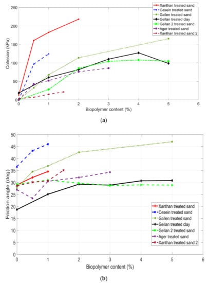 Variation of shear strength parameters of biopolymer-treated soils: (a) cohesion, (b) friction angle [82,123,150,156,157,159].