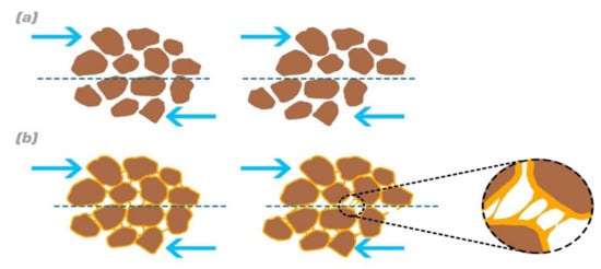 Residual strength is the lowest amount of stress that a material can tolerate: so that, if the applied stress is lower than residual resistance, no failure will occur [160]. The residual strength of sand treated by xanthan gum was also studied [159]; the results showed that the residual strength of dried samples experienced growth for both cohesion and friction angle. This growth could be attributed to the presence of van der Waals forces between xanthan hydrogel and sand aggregates. As biotreated sand samples remain ductile after failure, their residual strength was higher than sand samples improved by 10% and 20% gypsum. Unconsolidated-undrained triaxial tests also showed that xanthan and guar increased cohesion and frictional angle of coalmine waste. Xanthan indicated better enhancement compared to guar gum after 7 days of curing [125]. Also, Zhang et al. (2021) studied dynamic characteristics of lignin-treated silt. It was reported that dynamic shear strength and modulus were effectively increased using lignin, and a decrease was observed in damping ratio [147]. The schematic form of soil with and without biopolymer treatment under direct shear testing has been presented in Figure 7. The natural soil has a low shear strength due to the lack of cohesion among soil particles. The adhesive feature of biopolymer increases the cohesion among sand particles and leads to the formation of larger aggregation [124].