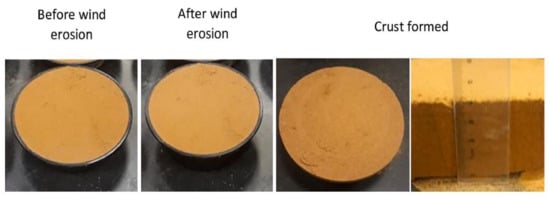 Another serious environmental problem occurring in dry sandy soils or anywhere covered with loose soil is wind erosion. Fugitive dust, as a major consequence of wind erosion, inevitably covers roads and crops leading to the reduction in farming productivity [166]. Biopolymers potentially improve the soil resistance against wind erosion by forming a firm crust over the sand surface, not even one crack was observed after a wind tunnel test on biopolymer treated samples (Figure 8). Xanthan gum and guar gum gave better performance compared to carrageenan and modified starch [120,166,167]. Moreover, the durability of xanthan and chitosan-treated soils is expected to be effective, at least up to two weeks against wind erosion [166,168]. In a relatively large-scale project aimed at dust mitigation for 90 days, synthetic polymers demonstrated better efficiency in the reduction of dust amount in comparison to guar gum as a biopolymer [169]. In terms of mine tailing stabilization, the weight loss of mine tailings treated by both xanthan and guar gums was smaller than water-treated sample; however, after five cycles of wetting and drying, the reduction was greater than the first cycle due to microstructural damage, wet-dry cycles, and ultraviolet (UV) radiation [170].
