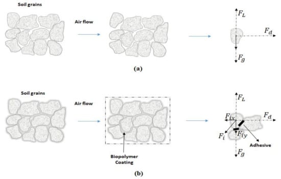 Figure 9 shows how soil resists wind erosion in both natural state and biopolymer-treated soil. As seen, a set of forces including resistant forces and driving forces exist during wind erosion. Driving forces consist of aerodynamic drag (Fd) and aerodynamic lift (FL), which try to disconnect the soil grains from the soil mass. Resistant forces include the gravity force (Fg) and the interparticle cohesive force (Fi), that prevent soils from being eroded [167,171]. In the natural state of the sand, Fg is defined as the weight of one soil grain. Typically, Fi has a small value because of the low amount of interaction among soil particles so that the airflow is easily capable of eroding the soil. When the biopolymer is added to the soil mass and after drying, the biopolymer hydrogel directly interacts with the soil by coating the soil particles and forming strong chemical bonds, which leads to the formation of a network consisting of soil grains and biopolymer. In this condition, the Fg is the weight of the whole soil mass so that it has an amount much larger than that in the natural state. Also, the inter-particle force is significantly increased because of the biopolymer network. The additional resistant force results in a higher total restraining force than the driving force, which remains unchanged in both biotreated soil and natural state.