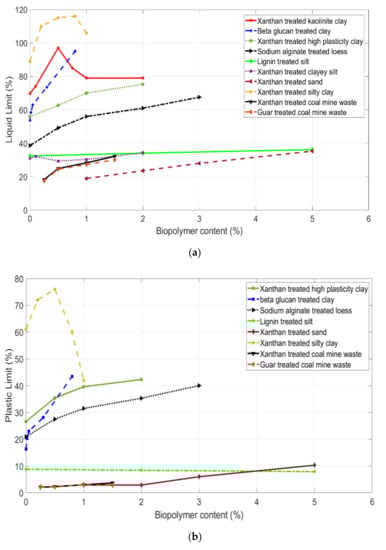 Atterberg limits are considered a fundamental concept of soil consistency in soil classification. Atterberg limit tests define the boundaries where clay and silt go through four different physical changes (solid, semi-solid, plastic, and liquid) by moisture content variation [172]. Figure 10 demonstrates how different biopolymers can affect the Atterberg limits of soils. As seen, almost all biopolymers have an increasing effect on the liquid limit (LL) (Figure 9a) and plastic limit (PL) (Figure 10b). Also, the more the biopolymer content, the higher the PL and LL. However, the growth trends of LL and PL vary based on the biopolymer type and soil characteristics; this difference of growth rates results in having both decreasing and incremental trends for PI via the increase in biopolymer content. The enhancement of LL for beta-glucan treated clay is due to the high-water adsorption of beta-glucan, a linear correlation to approximate the PI based on beta-glucan content has also been presented [154]. Lignin-treated silt experienced a reduction in PI after rising the amount of lignin, while PL and LL were increased; due to the quick cation exchange between silt and lignin, the lignin coated soil particles and formed a strong network by filling the pores [173].
