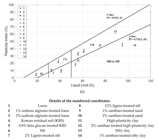 The relationships of the LL and PI for biomodified soils are presented in the plasticity chart (Figure 10c). It can be seen that adding sodium alginate into loess resulted in moving from the area of medium plasticity to high plasticity. This graph also shows that other biopolymer-treated soils tend to generate greater plasticity. This variation is directly related to the amount of surface charge and the size of clay particles in which biopolymers can be effective, in terms of hydrogel formation and electrical interactions. The cohesionless sand develops low plasticity after the addition of 1% xanthan gum. This improvement for desert sand is in accordance with achieving high erosion resistance as well as controlling soil degradation and desertification.