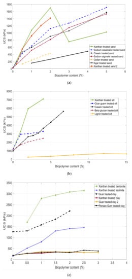 The unconfined compressive strength (UCS) test is the most common test used for evaluating the role of biopolymers in soil treatment [148]. As the interaction way of biopolymer with different soil types could be entirely different, in this section, the UCS is separately discussed for each soil type.