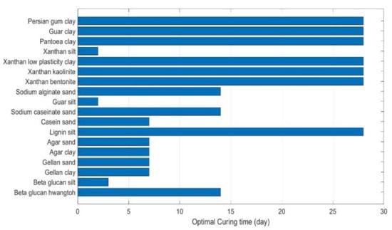 Biopolymers improved the compressive strength of silty soils by adding a cohesive component in addition to the silt’s frictional strength. Figure 5b shows the compressive strength of silt stabilized by 2% of alginate, beta-glucan, guar gum, and xanthan gum. The same silt has been used for all these biopolymers. Xanthan gum gave a better performance in comparison with others, although all four biopolymers led to the enhancement in the compressive strength. Also, alginate and beta-glucan increased the UCS to almost the same level [117]. It has also been indicated that beta glucan effectively increased the compressive strength of hwangtoh soil (MH) up to 200% for 0.496% of biopolymer. The properties of beta glucan-treated soil were governed by the available cations in soil (Na+, K+, Ca2+, Mg2+), charges in the soil surface as well as electrical interactions between the biopolymer [154]. Other biopolymers such as lignin have also presented good results on improving the geotechnical behavior of silt [58].