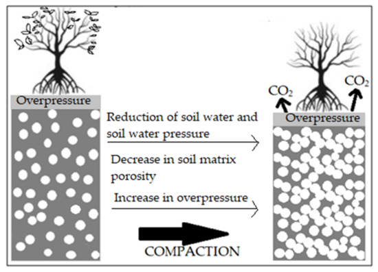 Properties of soil structure before (left) and after (right) compaction takes place. Emission of CO2 occurs when dehydrated organic-rich soils are exposed to atmospheric oxygen (modified from Yuill et al. [8]).