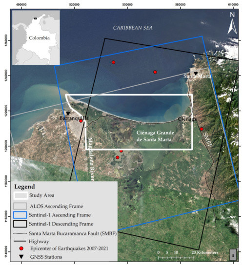 Last, the deformation values obtained using SAR data were compared and validated with the velocity values from two permanent GNNS stations located in Barranquilla (11.0197°/−74.8496°) and Santa Marta (11.2253°/−74.1870°). Despite these stations being situated outside the study area, the satellite frames covered their locations, rendering them helpful to establish whether the trends found using these two approaches were alike (see Figure 2 for the location of GNSS stations).