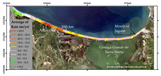 From the mouth of the CGSM to the 20th km, erosion ranged between −1 and −10 m/yr (see pink and yellow transects in Figure 4). This erosion peaked along the stretch between the 20th km and La Atascosa lagoon (orange and red transects in Figure 4) and reached local average values up to −25 m/yr. Erosion rates progressively decreased westward from this lagoon and changed to accretion west of the El Torno lagoon (see green colors in Figure 4), where a levee, built at the mouth of the Magdalena River, hampers the westerly movement of sediment. The most significant erosion rate values for 2010–2020 occurred seaward of La Atascosa lagoon. Upon inspection of the imagery, it was observed that this largest average erosion rate was produced from the migration of an inlet after a breach of the lagoon in 2016.