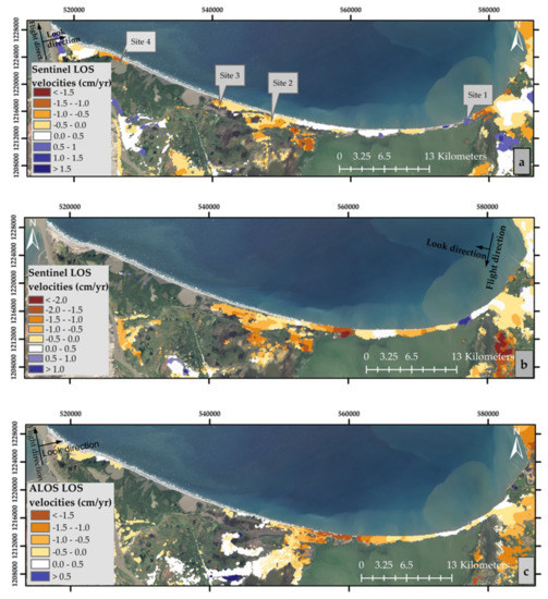 LOS velocities from Sentinel-1A and B show the same trend as the overall VLM (Figure 5) along the deltaic barrier island, suggesting that the vertical component of land displacement dominates over the horizontal component at this incident angle (Figure 6a,b). LOS velocities related to scatterers in the coastal town of Ciénaga were around zero for all three tracks illustrated in Figure 6, and became smaller (i.e., subsidence increased), southward from the town, towards the eastern margin of the CGSM. Westward from the town Ciénaga, specifically in the stretch of coast between the mouth of the CGSM to Kangarú (see Figure 2b for locations), LOS velocities of Sentinel-1A showed a zone ranging from 0 to +0.5 cm/yr (white colors in Figure 6a), whereas both ALOS and Sentinel-1B indicated LOS velocities ranging between −0.5 and −1.5 cm/yr (see orange and brown colors in Figure 6b,c). Westward of Kangarú (close to site 2 in Figure 6a), the LOS velocities of ALOS, Sentinel-1A, and Sentinel-1B revealed negative values along the coastline and around the wetlands.