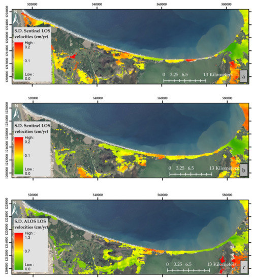 Standard deviation (S.D.) for each pixel of the estimated LOS velocities for (a) Sentinel-1A ascending track for 2017–2021; (b) Sentinel-1B descending track for 2017–2021, and (c) ALOS ascending track for 2007–2011. Red/green colors indicate high/low variability in the LOS velocities over time.