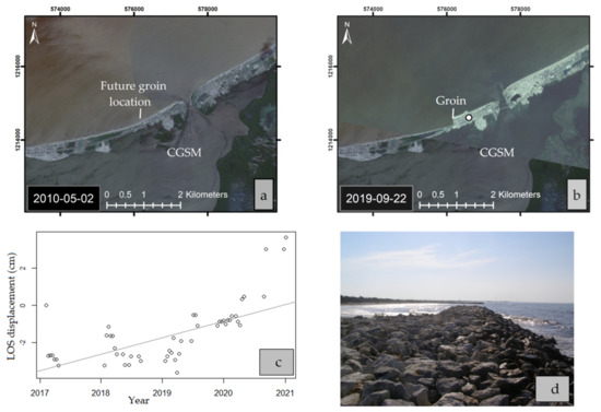 Satellite images before (a) and after (b) the groins were installed. Location of time series is indicated by white dot; (c) LOS displacement time series from Sentinel-1A for 2017–2021 (line represents the best fitting line with a slope of 0.9 cm/yr), and (d) photograph of the groins taken in 2014. Source of imagery: GeoEye images provided by Planet Labs Inc.