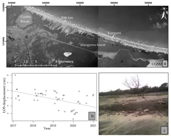 A rise in relative sea level as a product of either subsidence or an increase of GMSL creates more space for sediments to accumulate (i.e., accommodation space) [64], which is an underlying condition for transgression to occur. In other words, for any given interval of time, accommodation space is created by a rise in sea level and/or subsidence. Thus, where rates of accommodation space are larger than sediment deposition, there is a landward shift in sedimentary environments, an expansion of the subtidal zone [65], and a landward displacement of the barrier [34]. Although stratigraphic evidence of a transgressive succession was not gathered in this work, previous mapping of chronic erosion in conjunction with frequent overwashes between Kangarú and Cuatro Bocas [24] indicate that transgression might occur along this stretch of coast. Transgression was identified by two processes acting in tandem on the landscape: (i) storm overwash deposition resulting in temporal accretion of sediments landward of the contemporaneous shoreline, followed by (ii) a period of more gradual erosion interrupted by a new overwash cycle. Thus, we suggest that subsidence velocities of up to −1 cm/yr in the observed stretch of coast are a factor that underpins transgression of the coastline and the occurrence of overwashes, resulting in a landscape composed of scarped dunes and eroding beaches overlain by washover fans and surrounded by overwash channels. The spatial variability of VLM and LOS velocities east of Kangarú (see Figure 5) refrain us from extending the hypothesis of a transgressive shift of the coastline to the stretch of coast seaward from the CGSM.