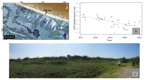 Figure 9 and Figure 10 illustrate the time series of an area that was densely vegetated with mangroves until the 1980s (site 2 and 3, Figure 6a). This sector became the location of frequent overwashes that left behind sandy deposits, buried vegetation, and vegetated dunes scarped by erosive processes [24] (Figure 9c). Typical time series show gradual downward displacement with slopes of approximately −0.5 cm/yr (Figure 9b and Figure 10b).