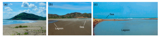 La Mancha: (a) beach; (b) the lagoon inlet closed by the sandbar in the dry season; (c) the open lagoon inlet in the wet season.