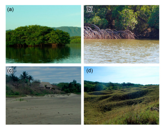 La Mancha: red mangrove in the (a) lagoon and (b) lagoon margins (Rhizophora mangle); (c) beach and coastal dunes; (d) vegetated dune field.