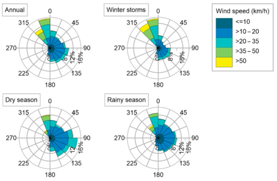 Annual and seasonal wind roses for La Mancha, data from Era5 [23].