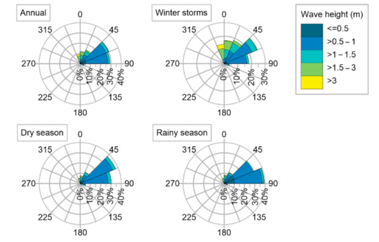 Wave roses (Figure 5) for the 19.5° N 96° W coastal cell, obtained from the Era5 database [23], show that the most energetic waves come from the NE, with a 30% frequency and heights of 0.5–1 m. In winter, waves approach from the NE, with heights of 1–1.5 m, and the highest wave heights come from the NW (315° to 360°). Overall, the highest wave heights occur during winter storms, and the lowest values are in the dry and rainy seasons.
