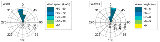 Figure 6 shows the annual wind and wave roses for extreme events for the area of La Mancha. The data correspond to the coordinates 19.50° N 96.25° W and were obtained from the Maritime Climate Atlas of Instituto de Ingeniería UNAM [26], calculated from 1948 to 2010 with the WAM-HURAC numerical model [27]. The wind rose includes hourly data with a wind velocity of >50 km/h (0.29% of the 1948–2010 time series). The wave rose includes hourly data with a wave height of >5 m (0.17% of the 1948–2010 time series). It can be seen that the more energetic winds and waves come from the north.