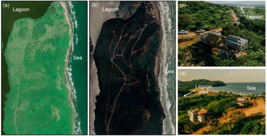 There is a wide variety of natural ecosystems in the study area, including mangroves around the lagoon (Figure 3a,b), coastal dune vegetation (Figure 3c), rainforest, tropical grassland, swamps, secondary vegetation, crop pasture and fruit trees. Mobile dune fields were reported to be mostly vegetated with C. punctatus and Palafoxia lindenii in 2008 [16], but recently, Schizachyrium scoparium became dominant and replaced those species (Figure 3d).
