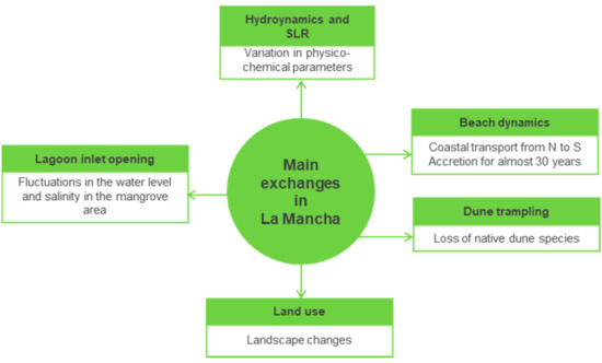 | Psuty et al., 2009 [15] | Interaction of alongshore sediment transport and habitat conditions at Laguna La Mancha, Veracruz, Mexico | An overview of the hydrological regime, the dynamic of sediments and the ecological features in La Mancha. |