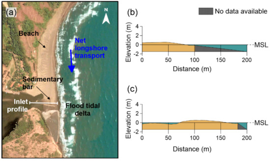 The main geomorphological components at the inlet are as follows: the tidal flood delta, and the sedimentary bar on the northern side of the inlet, which is a storm berm and is part of the beach (see Figure 9, the area corresponds to Area B in Figure 1). The berm is built up by sediment during storm surge conditions (winter storms and hurricanes). When there is a sediment deficiency, usually associated with erosive wave conditions, the berm breaks up [15]. The inlet is usually open from August to November and closed in December, with no definite pattern from January to September [18]. When the sedimentary bar is low and the inlet is open for a long period, intertidal exchanges sequester sediments in the north of the lagoon, the area of the tidal flood delta extends and this part of the lagoon becomes shallower [15].
